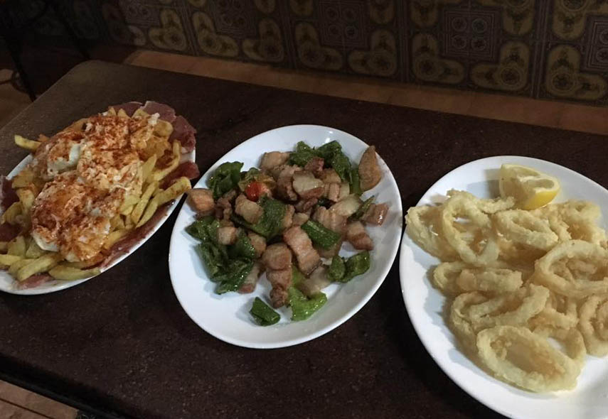 Huevos con patatas y jamón. Chuletillas. Panceta.